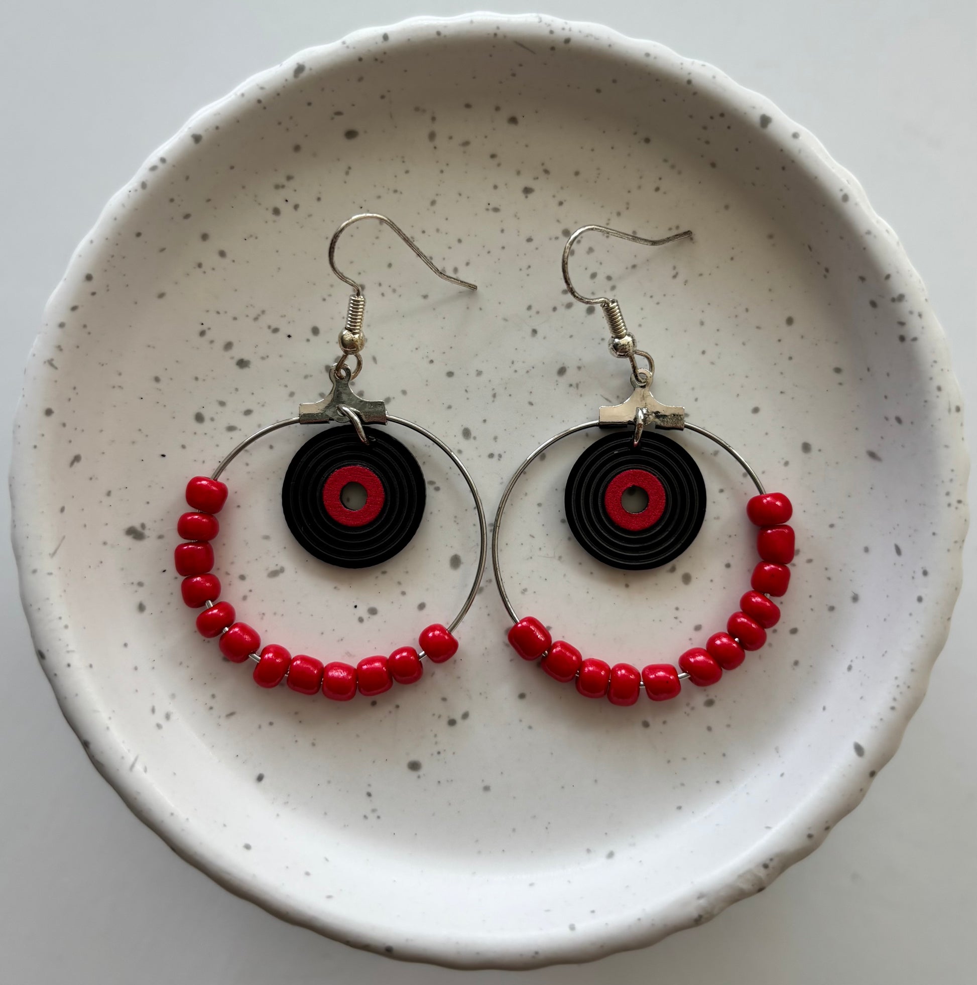 "Make a statement with our Vinyl Record Hoop Earrings, perfect for musicians and music lovers alike. Crafted with attention to detail, these unique earrings add a touch of artistic flair to any outfit. Express your love for music with this exclusive accessory. Limited quantities available."